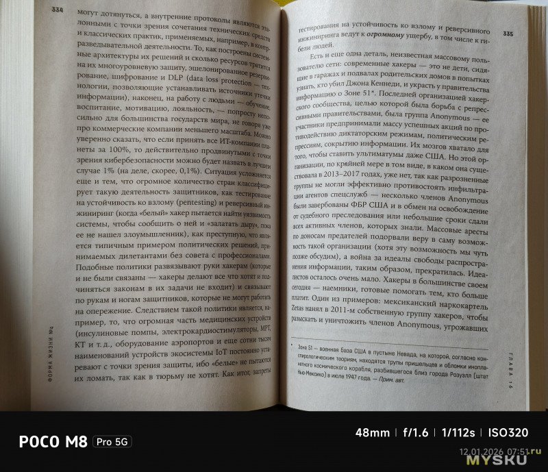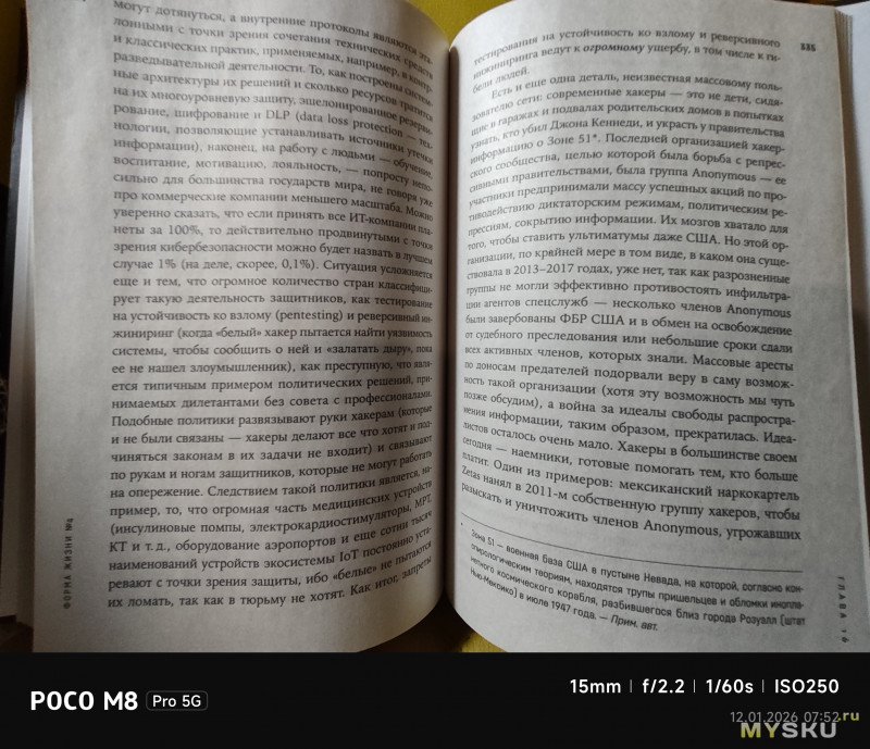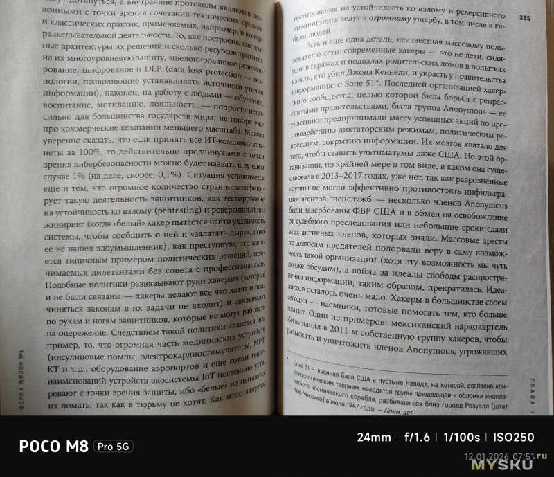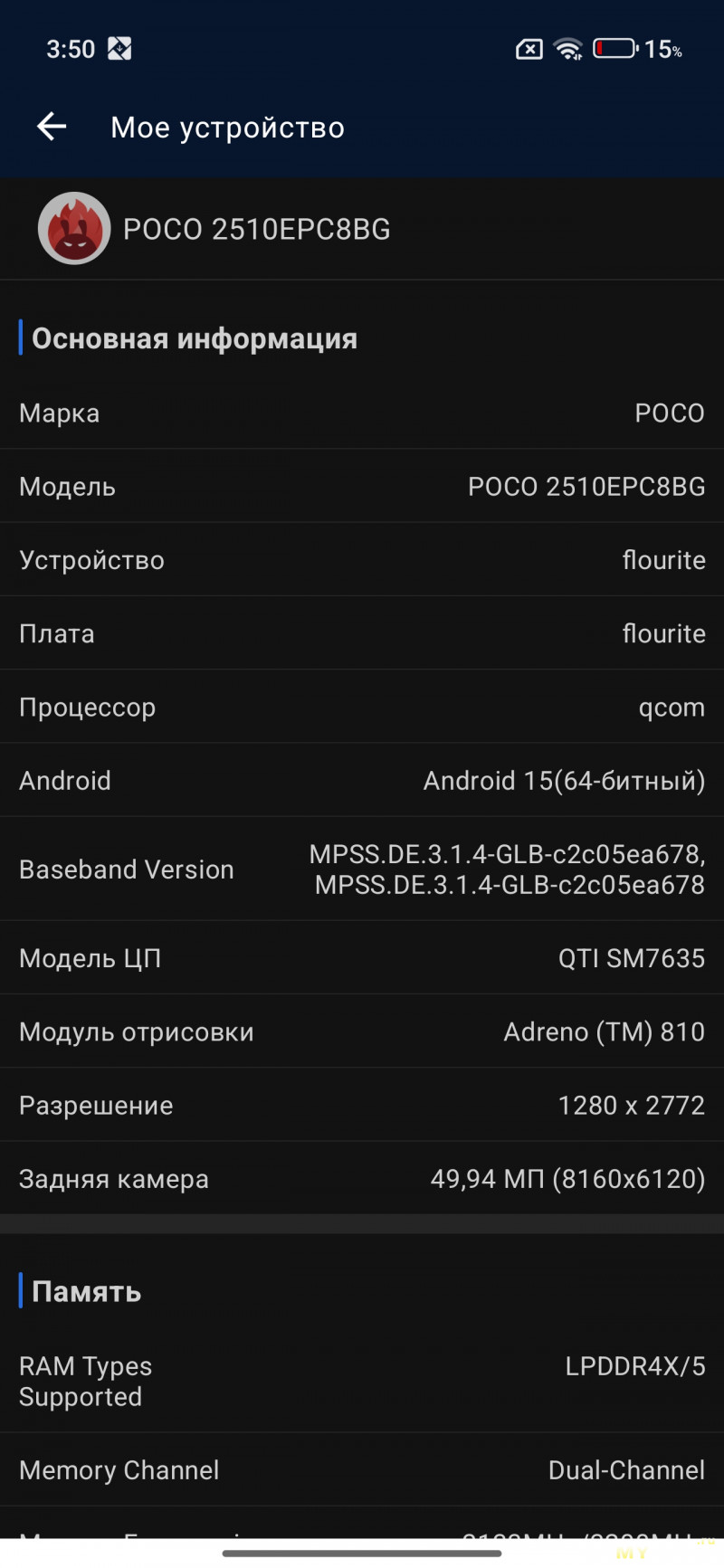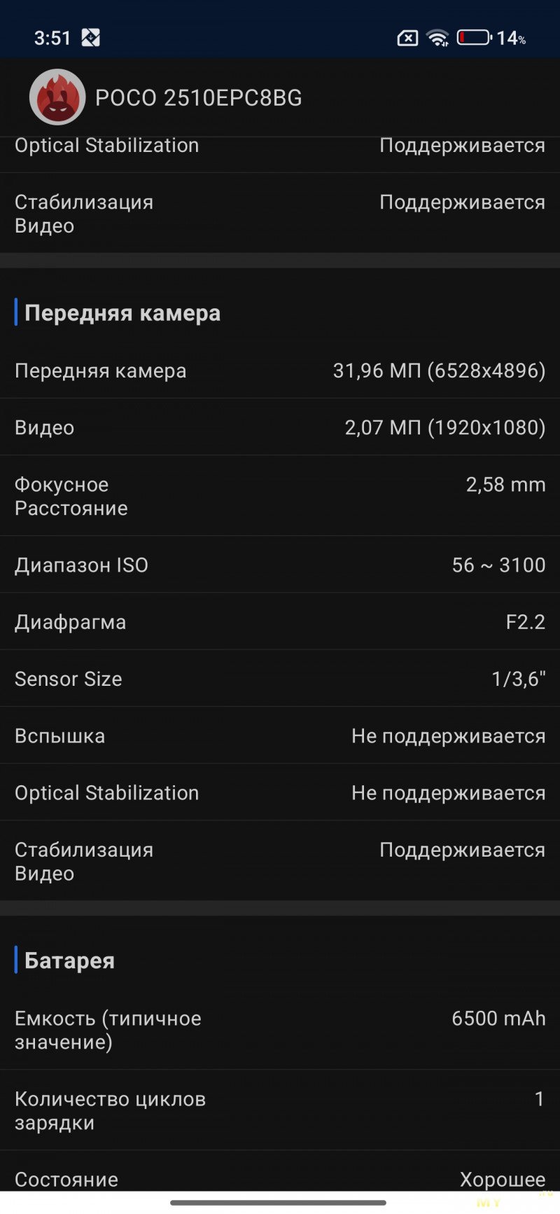 Камеры на тыльной стороне устройства две — основная (OmniVision OV50E, 50Мп, 24мм, F1.6) и широкоугольная (OmniVision OV08F, 8Мп, 15мм, F2.2) — не так много по современным меркам. Отдельной макрокамеры нет, впрочем, по опыту она не особо нужна, так как с задачей съёмки на МДФ хорошо справляется и основная камера. Широкоугольная камера не поддерживает автофокус. Телевики же обычно являются прерогативой флагманских моделей смартфонов, но снимая на Poco M8 Pro через основную камеру доступно двухкратное цифровое увеличение, а на снимках впечатывается соответствующая подпись с фокусным расстоянием 48мм. Видеосъёмка не предлагает выдающихся режимов записи, здесь всё обычно — 1080@60 либо 4К@30. Есть оптическая стабилизация картинки, которая хорошо сглаживает дрожания рук. Замедленная съёмка позволяет записывать видео либо в 1080@120, либо в 720@240. Кодеки для записи видео выбираются — H264 или H265. Фотокамера поддерживает съёмку в RAW.
