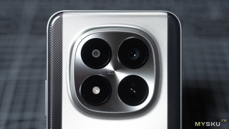 Наверху над корпусом плавно возвышается «остров» с четырьмя модулями: две камеры (основа + широкоугольная), LED-вспышка и ИК-порт для управления бытовой техникой в качестве пульта ДУ. Основная камера 50MP Light Fusion 800 (на сенсоре OmniVision OV50E), диафрагма f/1.6, с поддержкой оптической стабилизации. Широкоугольная камера 8MP на сенсоре OmniVision OV08F с диафрагмой f/2.2, без автофокуса.