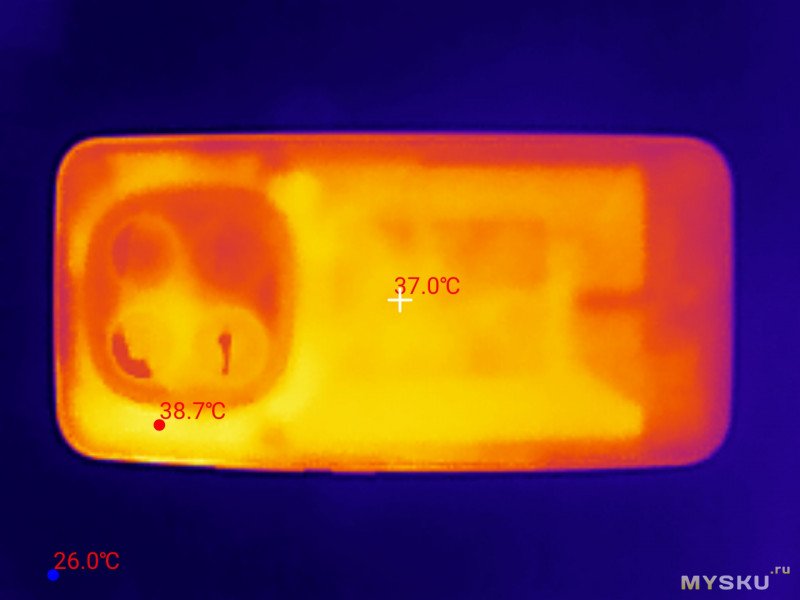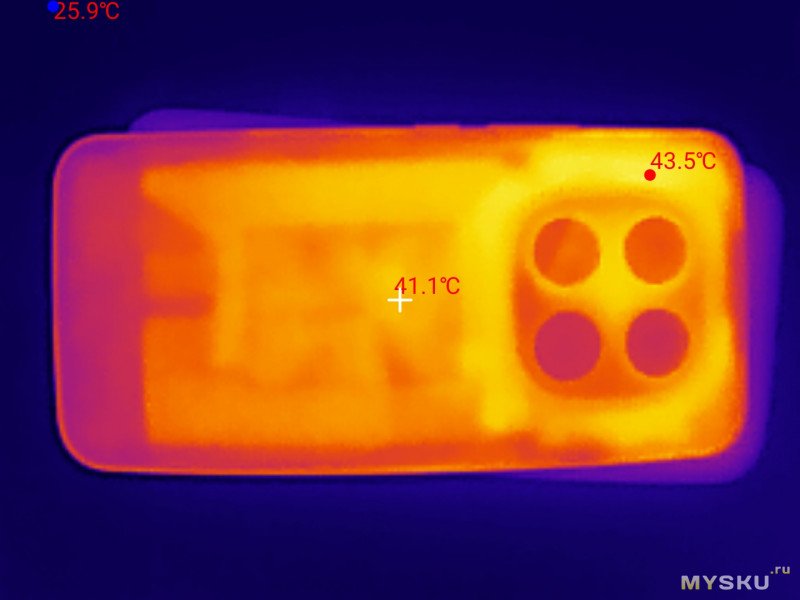 Максимальный нагрев достигал примерно 44°С, в месте рядом с модулями камер.