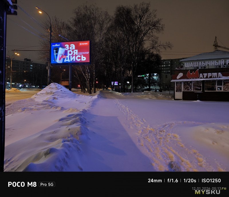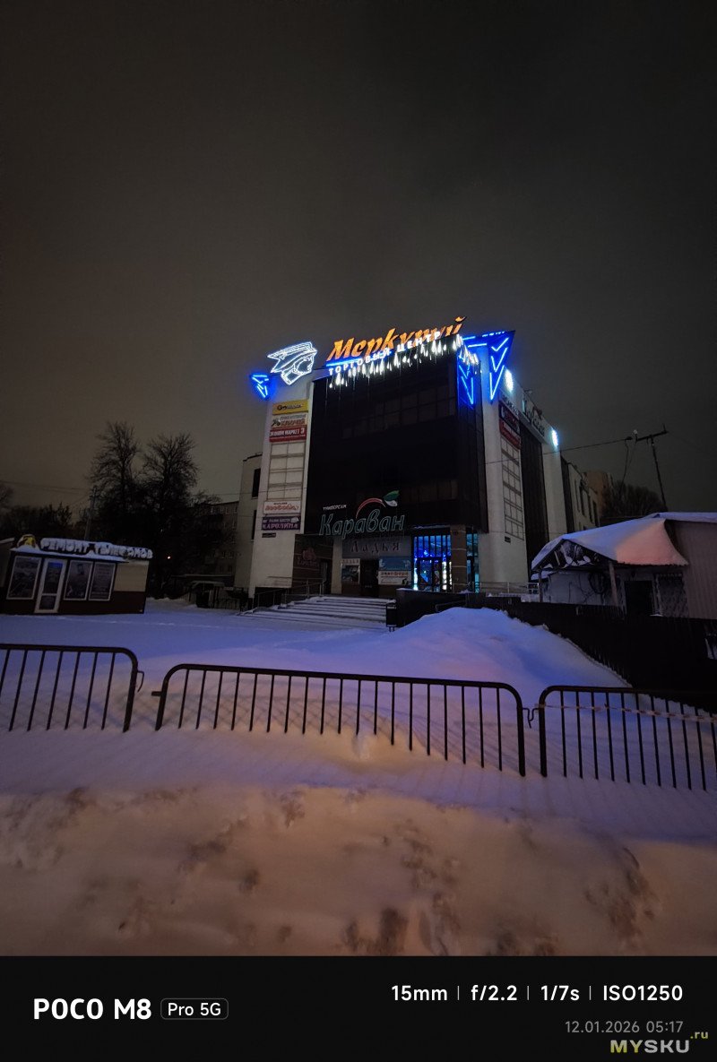 В ночное время фото получаются относительно чистые от шумов, но требуется время в пару секунд, чтобы снимок получился.