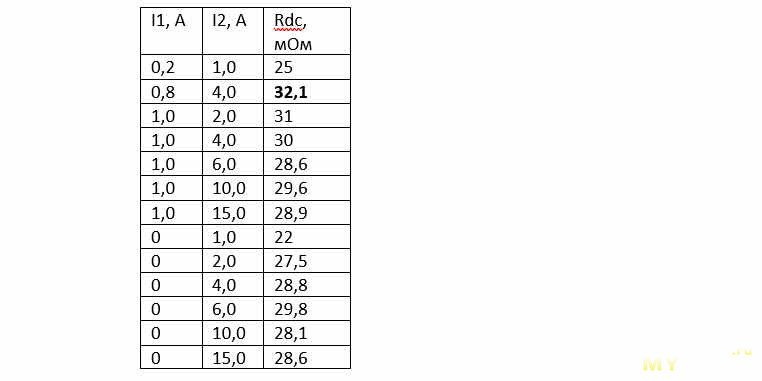 Таблица 1. Зависимость Rdc от выбора токов I1 и I2Во второй строке Rdc =32,1 мОм измерено по значениям тока, соответствующим ГОСТу.