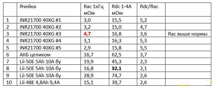 В строках 7-9 добавлены для сравнения значения Rac и Rdc, измеренные для обычных (не таблес) ячеек 21700, бывших в эксплуатации на электровелосипеде и убитые в разной степени, а в строке 10 – новая ячейка 21700, не помню откуда взялась.