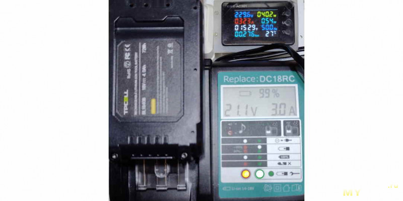 Разрядил аккумулятор до напряжения чуть меньше 20В и снова поставил на зарядку, но уже на ЗУ TPCELL 4А 21В, настроенную на 21,0В и ток 1,5А, и умеющую CC-CV.