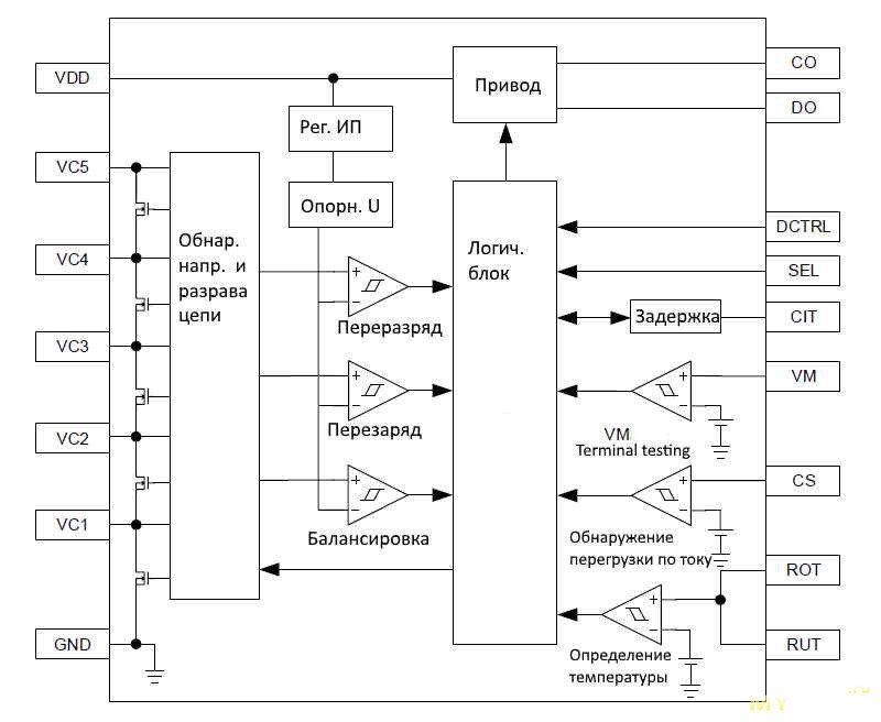 В качестве примера рассмотрим защиту от перегрузки по току 1: разрядный ток следует за внешней нагрузкой. Если вывод CS обнаруживает, что напряжение на резисторе измерения тока превышает пороговое значение защиты от перегрузки по току 1 (VEC1) и остается выше времени задержки защиты от перегрузки по току 1 (TEC1), вывод DO выдает низкий уровень для выключения разрядного MOSFET, останавливая разряд.