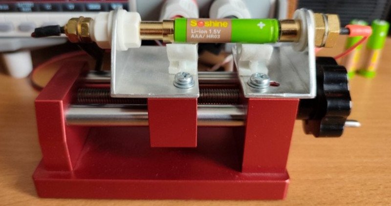 Судя по всему, это обычная приблуда для ремонта часов (пример на озоне — https://www.ozon.ru/product/stanok-dlya-remonta-chasov-s-koltsevym-mundshtukom-3252884723), на которую автор накрутил алюминиевые уголки для удобного крепления батареек. Контакты самодельные, из того что было.