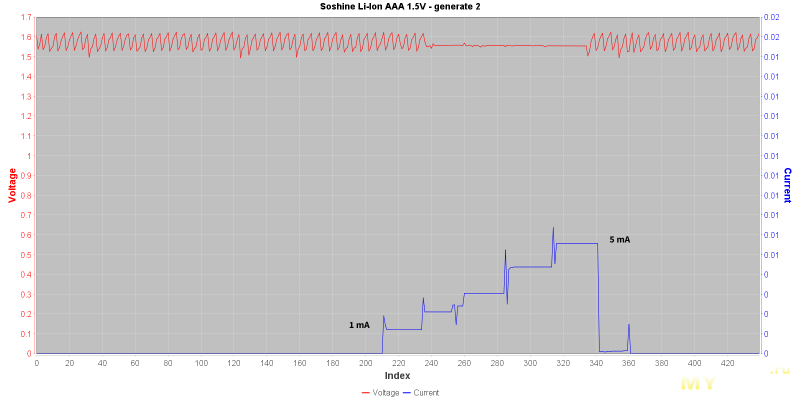 Без нагрузки, напряжение выхода «пилит» в пределах 1,5 ~ 1,6V. Период колебаний у каждой батареи разный от 1 до 5 сек. И меняется он в зависимости от разряженности.