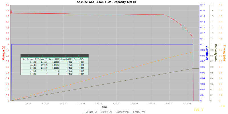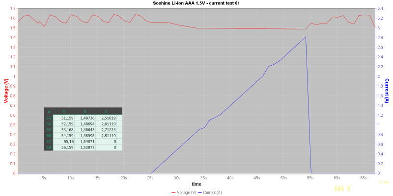 Тест показал 1,48V при токе 2,9А. Что конечно, отлично для аккумуляторов этого формата. Понятно, долговременно такой ток отбирать нельзя...