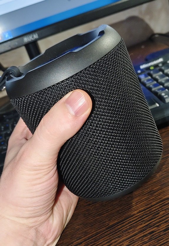 Колонка сделана в форме небольшого бочонка, в руке помещается с легкостью. Корпус прикрыт прочной акустической тканью, на боковой грани размещается логотип бренда Tronsmart. Для удобства перемещения предусмотрена удобная петля, чтобы подвесить колонку. Но, к примеру, на палец, сучок или сумку она разместится. А вот в специальный держатель для бутылок на велосипеде или карман рюкзака уже не получится. Единственный активный динамик направлен вверх, а по бокам расположены дополнительные пассивные излучатели усиливающие басы. Накладки излучателей выполнены из пластика желтого цвета (ближе к золотому) и имеют большой ход работы.