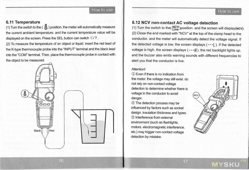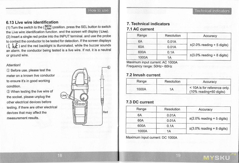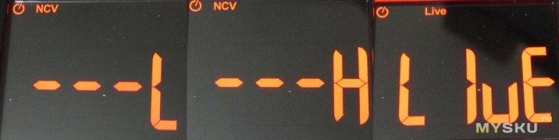 NCV — два уровня, L и H. На воздухе от сетевого провода где-то до 5-7см и до 20-30см. Live — щуп для определения фазы подключается в гнездо input.
