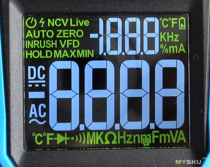 Пиковый ток вызывается длительным удержанием inrush, срабатывает только на переменном.2. Напряжение, умолчательно выбрано постоянное, входное сопротивление заявлено 10МОм, фактически намерялось ~11.Частоту у переменного показывает одновременно с напряжением, но от 2вольт, ниже нули.