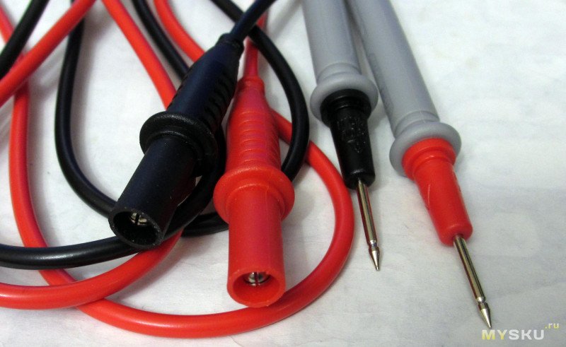 Щупы имеют прямые разьемы, провод длиной 80см, от кончика до кончика 98см, в комплекте колпачки, сопротивление низкое, 34мОм каждый (зачем непонятно — ток через них измерять не нужно), провод на выходе из щупов не крутится, похож на пвх. Контакт бывает не очень, как будто какая-то оксидная пленка.
