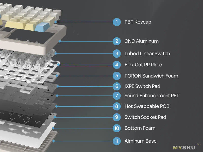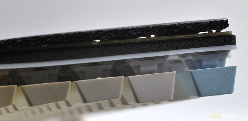 Клавиши прожимаются тактильно уверено, очень быстрый отскок. Gasket Mount с мягкой многослойной прокладкой дает такой приятный эффект. Вся структура: