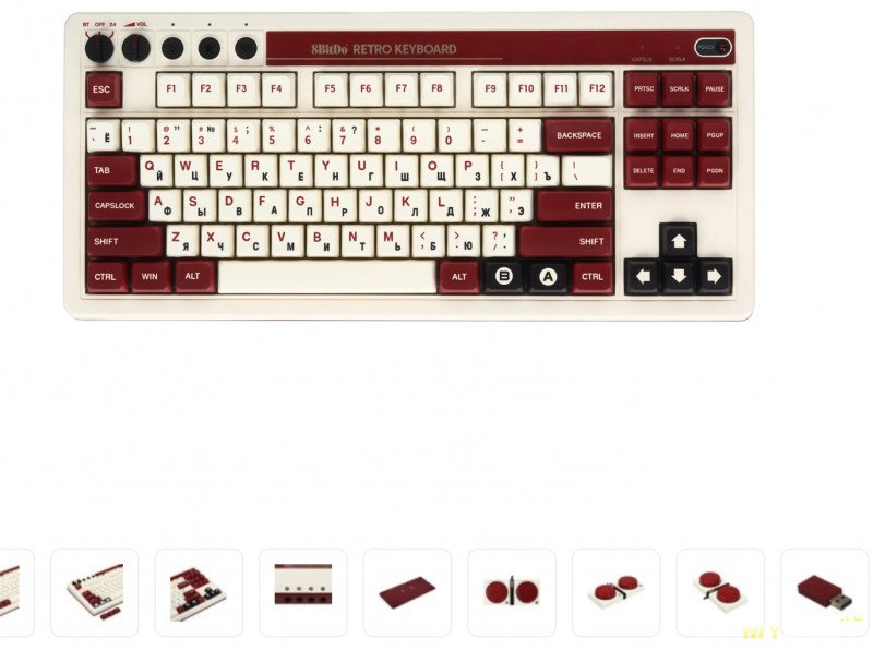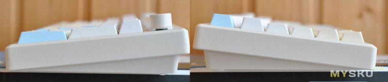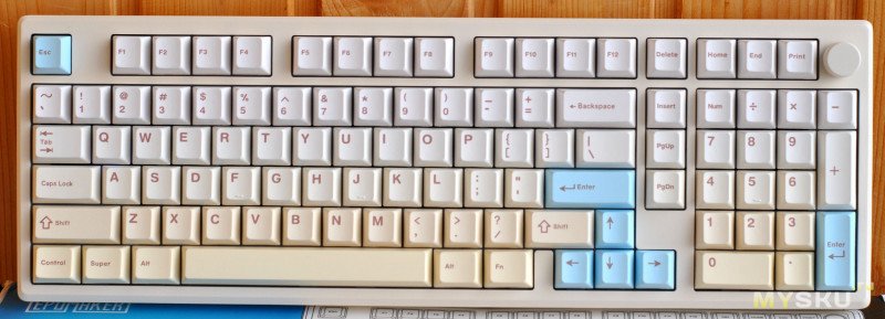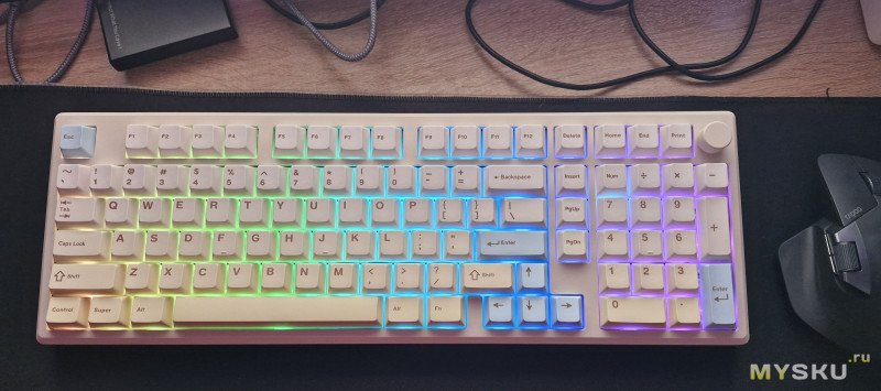 Пару слов о формате, 96% считается полноразмерной, но чехарда с клавишами Home, End, Delete и прилипший к стрелкам правый Shift поначалу вызывают дискомфорт. Точно нужно привыкнуть (а сэкономили жалких 2 см ширины).В правом верхнем углу нажимной энкодер (ручка без накатки) — в Win управляет громкостью и Mute.