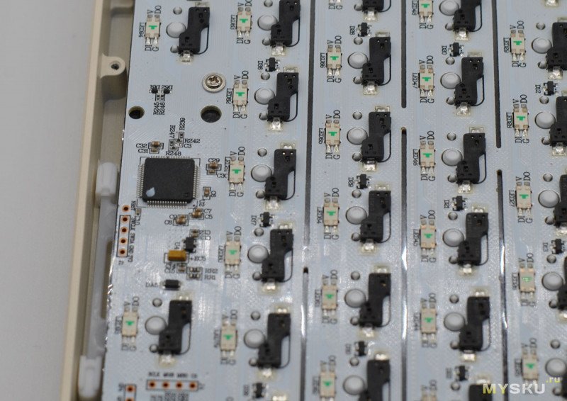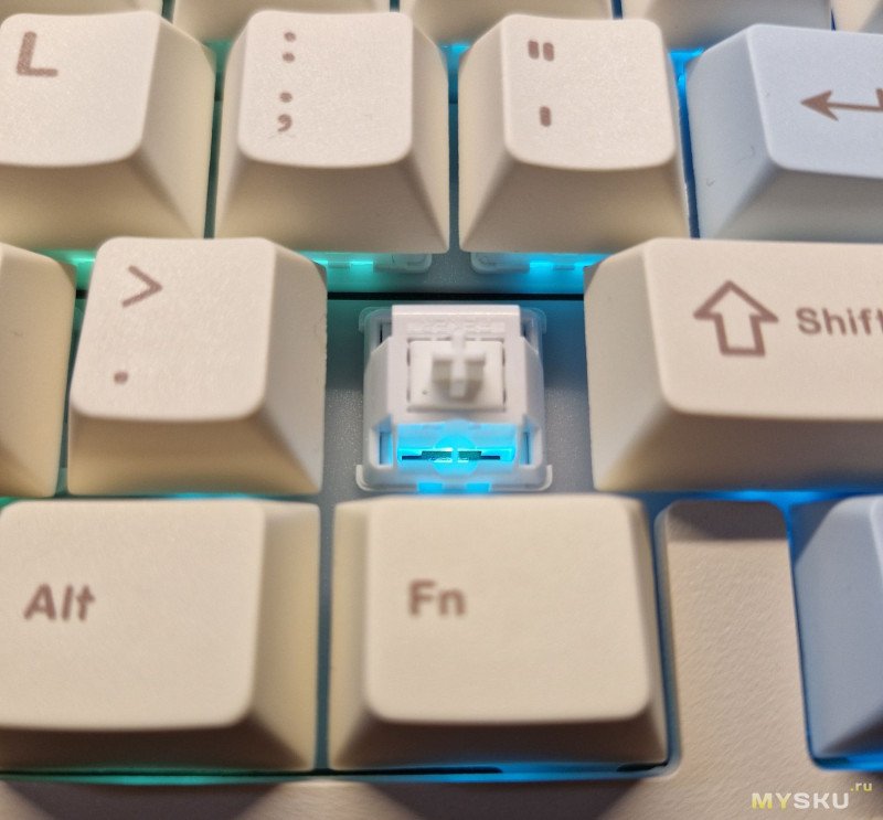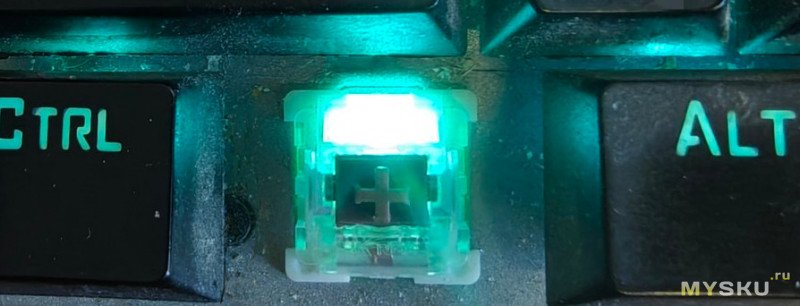 Горячая замена. Под каждым снизу светодиод подсветки (но без световода). У длинных клавиш есть двойная поддержка (не люфтит).