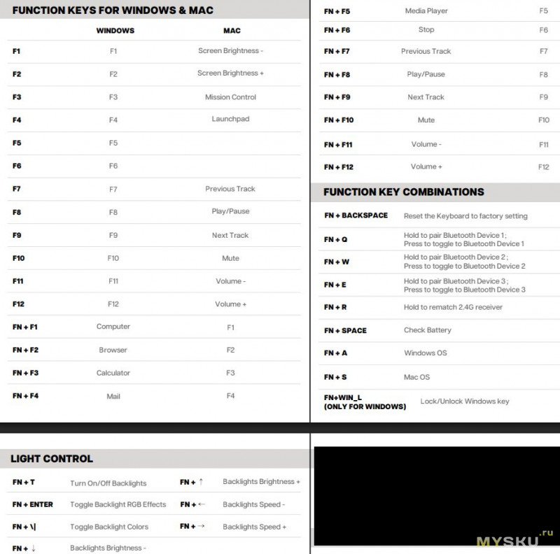 В иснтрукции есть список сочетаний клавиш (проверка зарядка, управление подсветкой, переключение устройств Bluetooth):