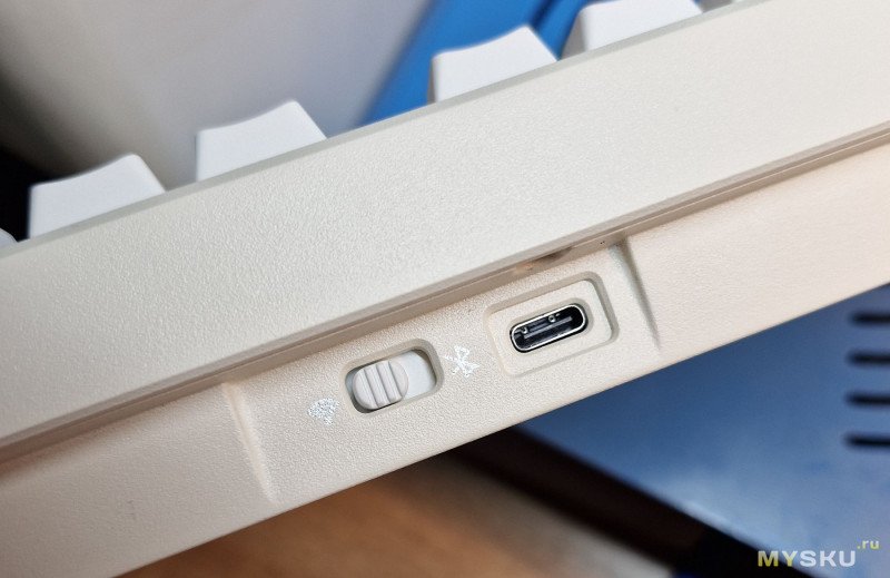 Порт для зарядки (и проводного режима) и трехпозиционный переключатель (болтается): 2,4 ГГц — выключено — BT5.0. По Bluetooth можно прицепить к трем гаджетам.