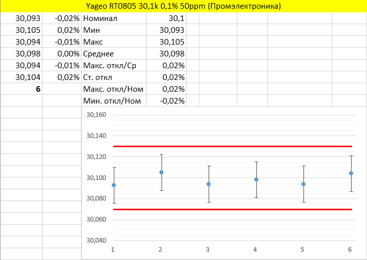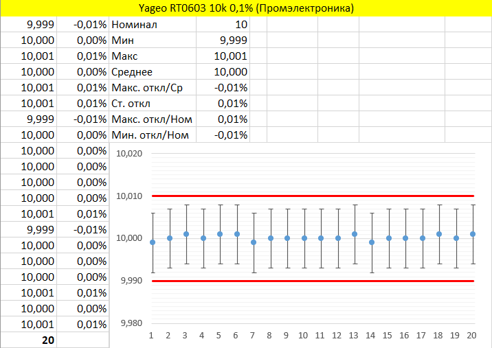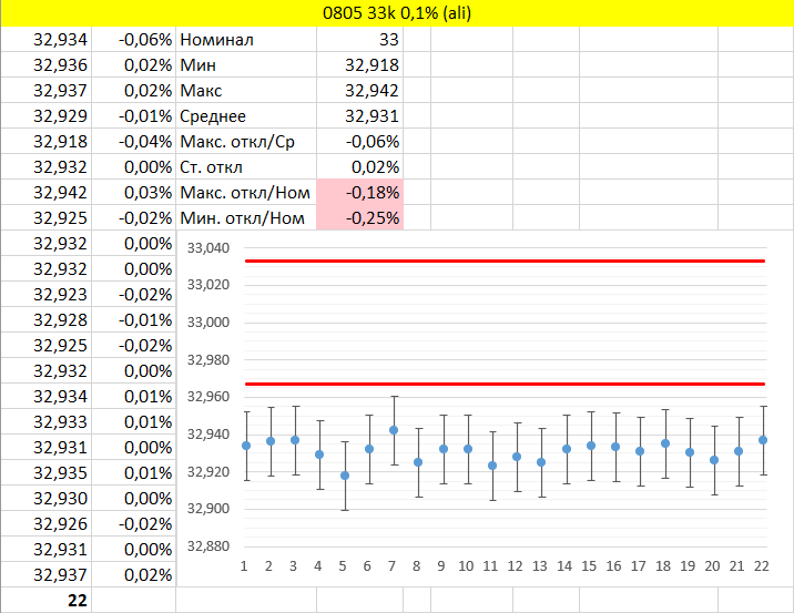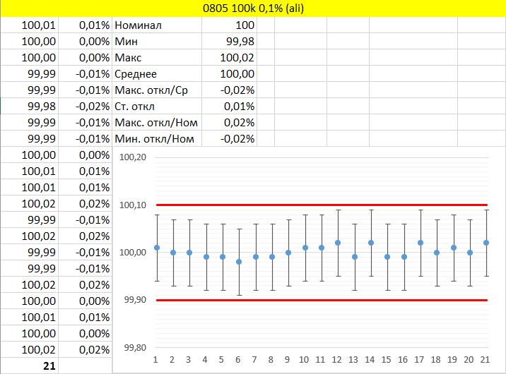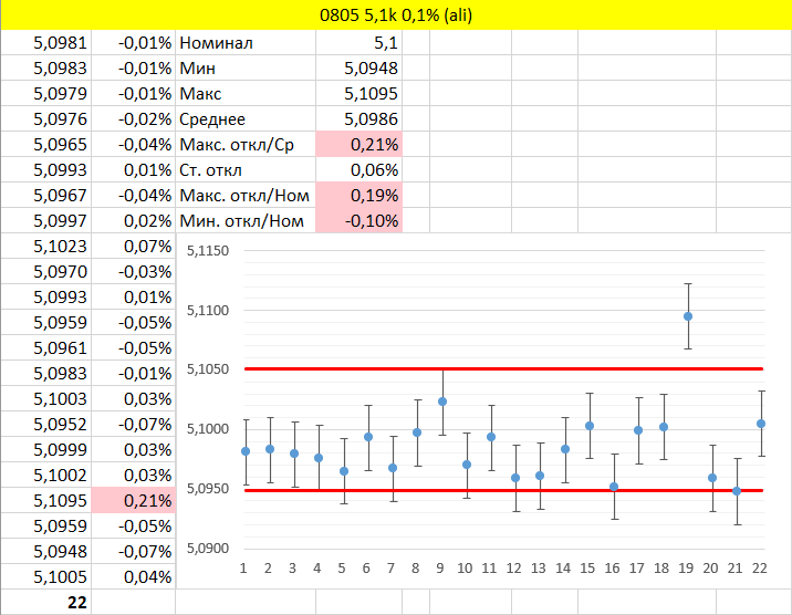 Здесь разброс значений заметно больше, некоторые резисторы практически на границе допуска, а у одного отклонение от номинала составило +0,19%. Впрочем, если не учитывать один бракованный резистор, то остальные всё-таки вписываются в заявленную погрешность.