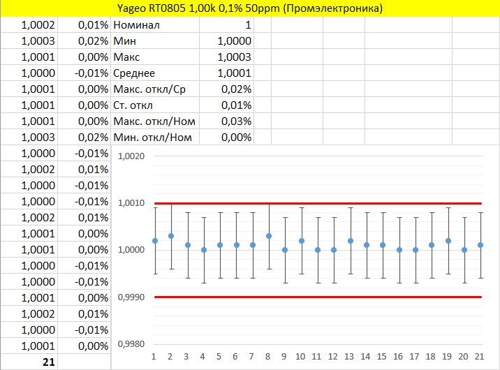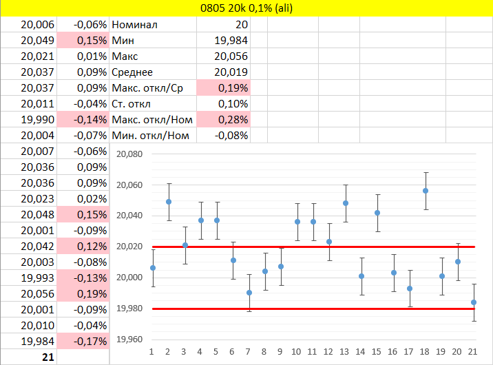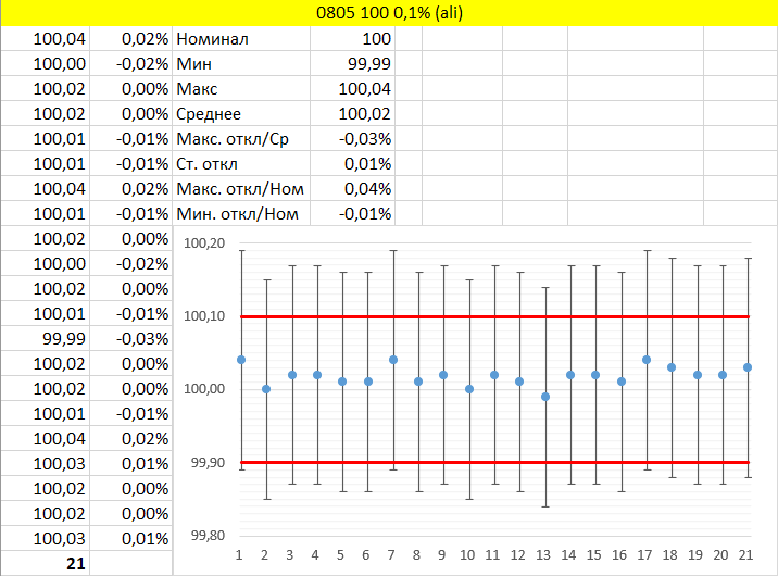 Нагляднее результаты можно посмотреть на диаграмме, красными линиями обозначены границы допуска ±0,1% от номинала, точками — измеренные значения, а вертикальными отрезками — возможный диапазон истинных значений с учётом погрешности мультиметра.