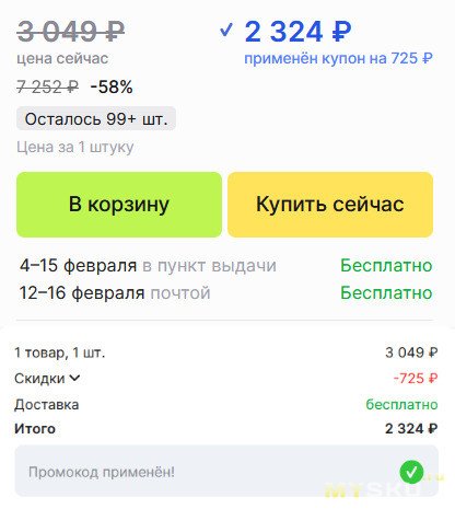 Промокод это тоже самое, что и даёт скидку продавец — ничего не суммируется, всё те же 725 руб…
