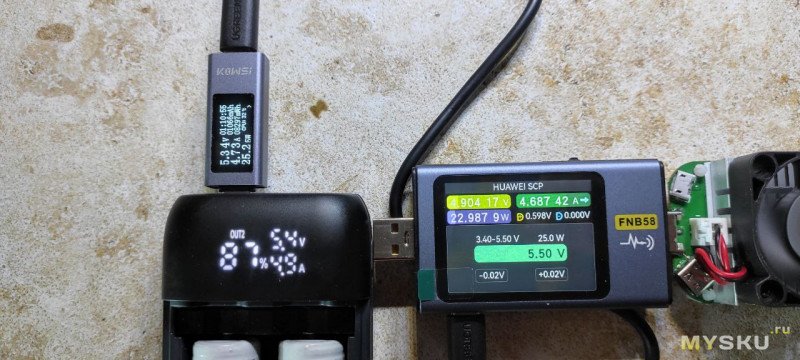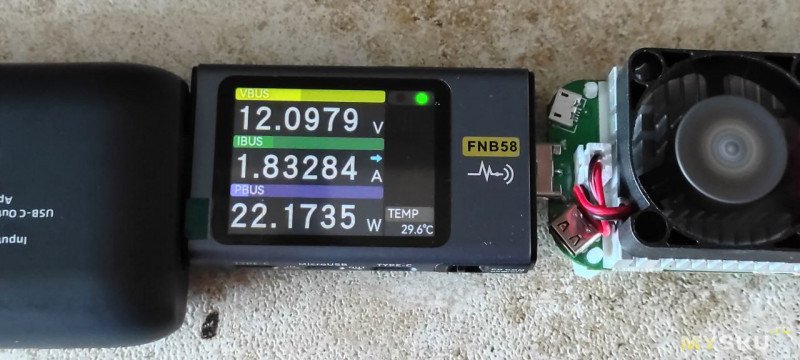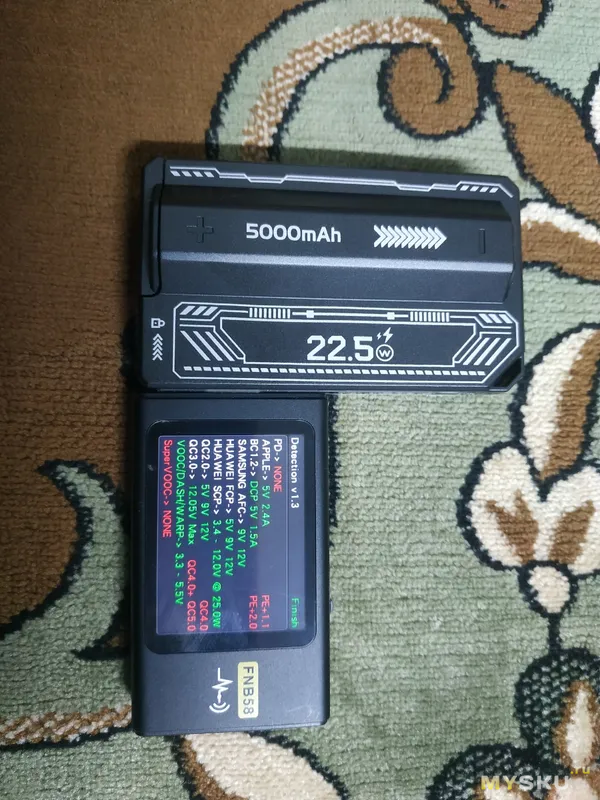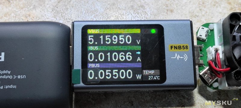 На большом тестере видно, что напряжение 4,9 вольта, но на самом деле это просадка напряжения на кабеле. Потому что я поднял напряжение до 5,4 вольта и повербанк реально отдает 5,4 вольта, маленький тестер на выходе это показывает. То есть повербанк отдает заявленные 25 ватт по протоколу SCP.