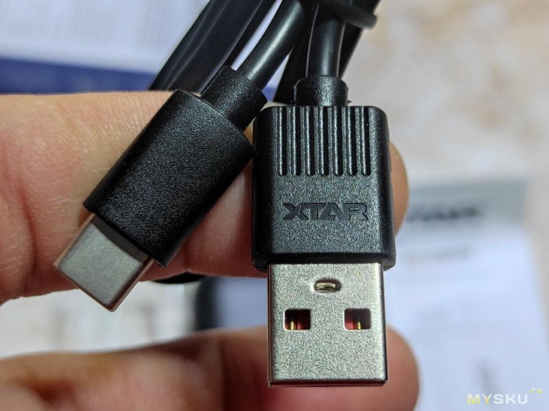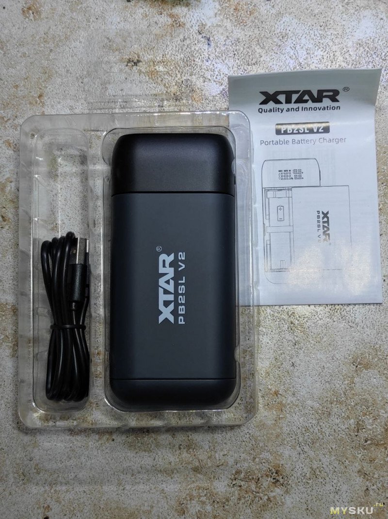 Внутри повербанк с кабелем и инструкцией в блистере.