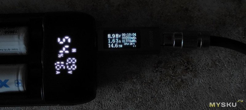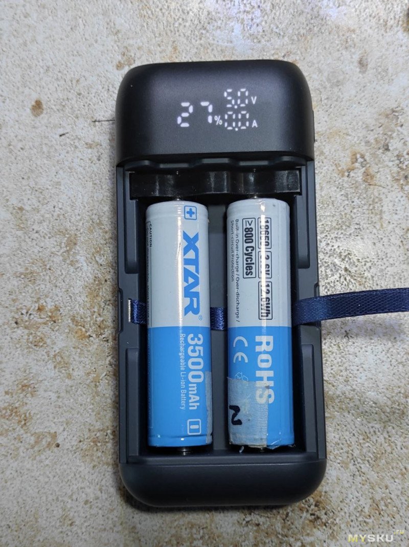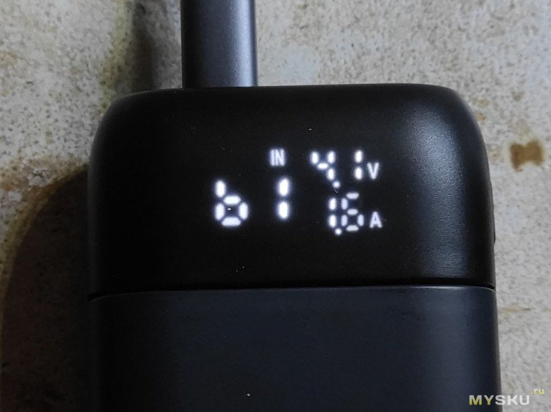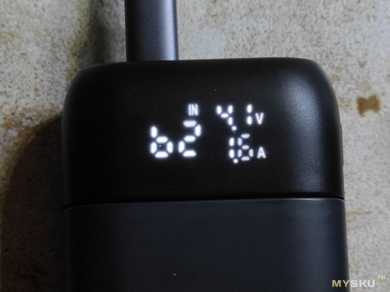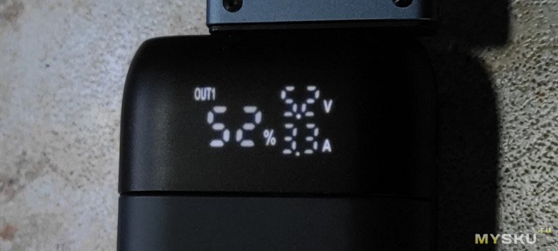 После установки акумуляторов повербанк показывает уровень заряда аккумуляторов, выходное напряжение и ток.