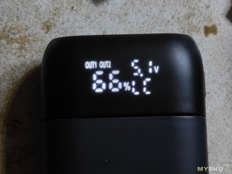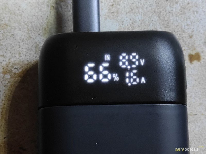 Если подключется нагрузка, то повербанк автоматически активируется и выдает напряжение на выход. При этом включается экран, показывает остаток заряда в процентах, ток, напряжение, OUT1 для USB A и OUT2 для USB-C. При зарядке на экране показывает IN.