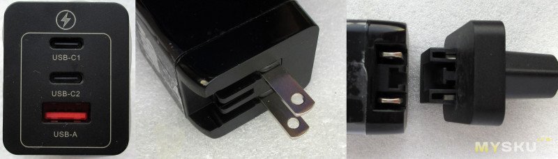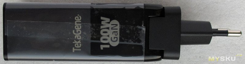 Захотелось зарядник помощнее чем 65Вт, на распродаже попалось нечто по отзывам способное на 100Вт. Как и где способное — будем посмотреть. С нормальной вилкой кончились, продавец отписал вопрос что делать и не дожидаясь ответа отправил вариант с плоскими и комплектным переходником, что-то менять было уже поздно. Но вроде кроме увеличения длины особых проблем тут нет, переходник родной и фиксируется нормально.