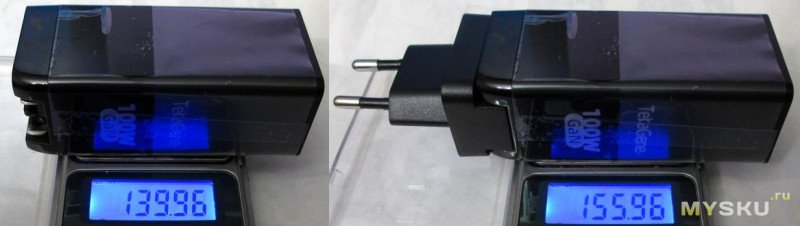 Весит поболее 65ваттных, 140г без и 156 с переходником: