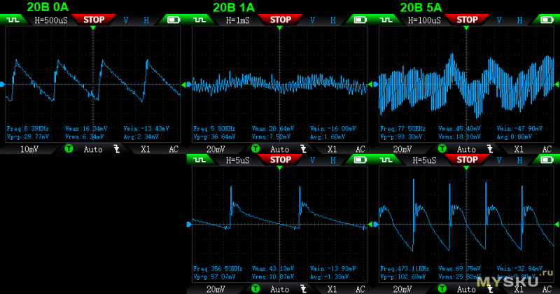 Пульсации умеренные, при максимальной заявленной мощности, на вч — 60мВ с иголками до 100мВ: