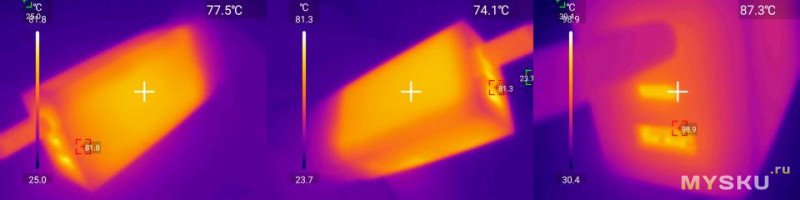 Нагрев за час работы 20В*5А — корпус до 80C причем стенки достаточно равномерно, внутри через отверстия разьемов видно около 100C при 25C: