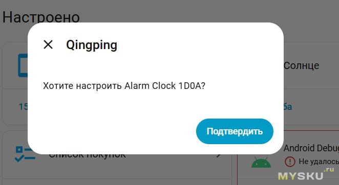 После нажатия кнопки: «добавить», в списке сразу был обнаружен будильник. Затем я выполнил всё по инструкции (нажал и удерживал будильник на несколько секунд), после чего он был успешно добавлен в приложение.