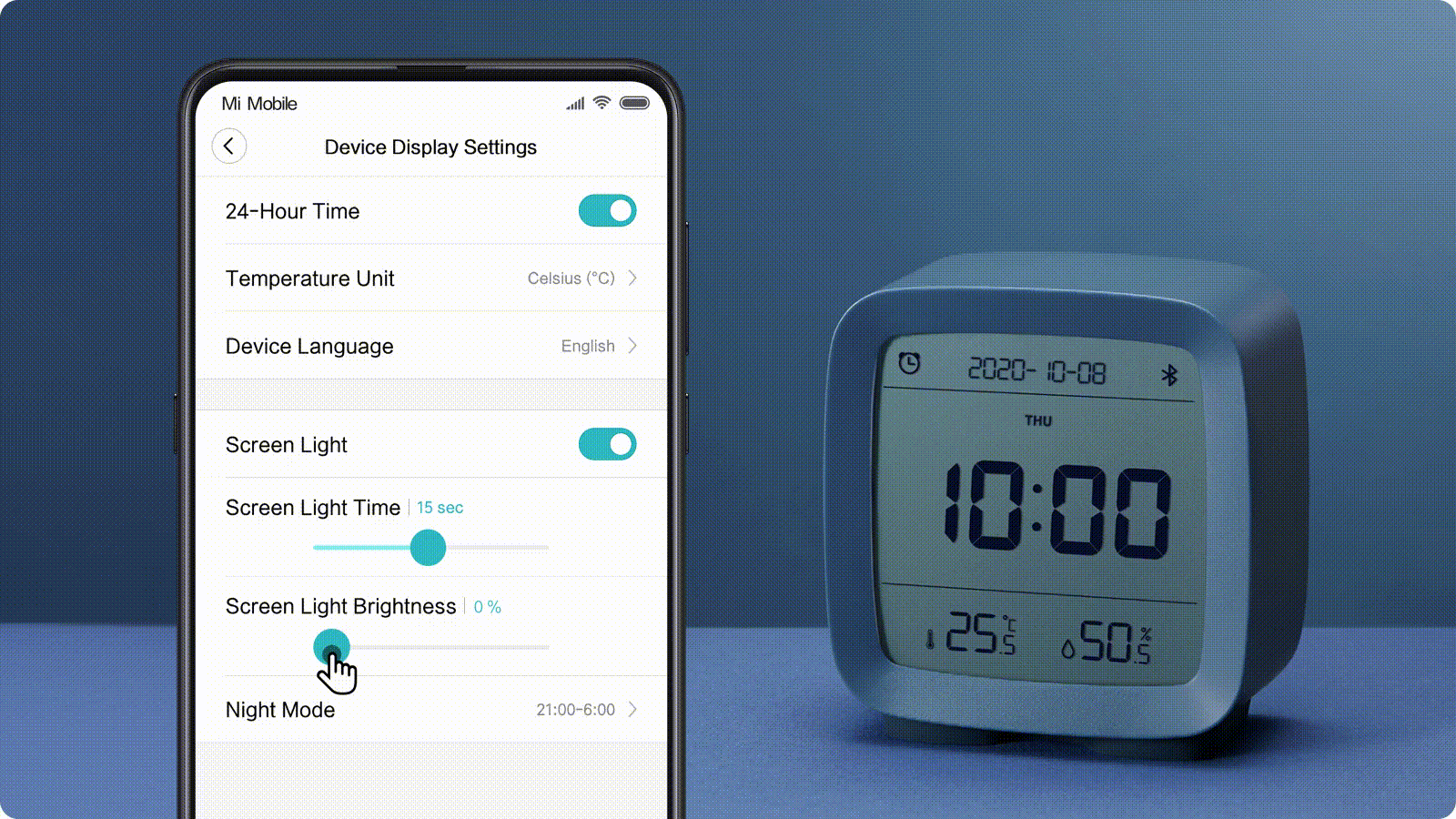 Механизм нажатия выполнен через ножку, которая сама по себе является единственной физической кнопкой. Мне такое решение очень понравилось, потому, что в таком исполнении есть достаточно приятный тактильный контакт. Будильник как бы продавливается и это однозначно лучше, чем кнопка была бы сенсорной. Для тех, кто застал советские будильники, это будет приятным «флешбэком» в былые времена. Служит кнопка для двух сценариев: отключение будильника и включение подсветки.