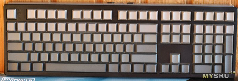 Внешний видПеред нами полноразмерная клавиатура шириной 44 см с пластиковом корпусом, маркировка на кейкапах sideprint — т.е. сбоку к пользователю. Обычно бывает общий рисунок сверху на клавишах, но тут просто градиент серого цвета. Плюсы есть — долговечность маркировки, подсветка адресно, минимализм. Но и для тех кто не владеет слепой печатью, это адъ.