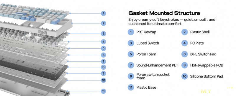 Но начинка известна. В конструкции использованы пять слоев звукопоглощающего материала: многослойную пену PORON, накладку переключателя IXPE, PET для улучшения звука, пену для гнезда переключателя PORON и силиконовую вставку на дно. Подробнее тут.