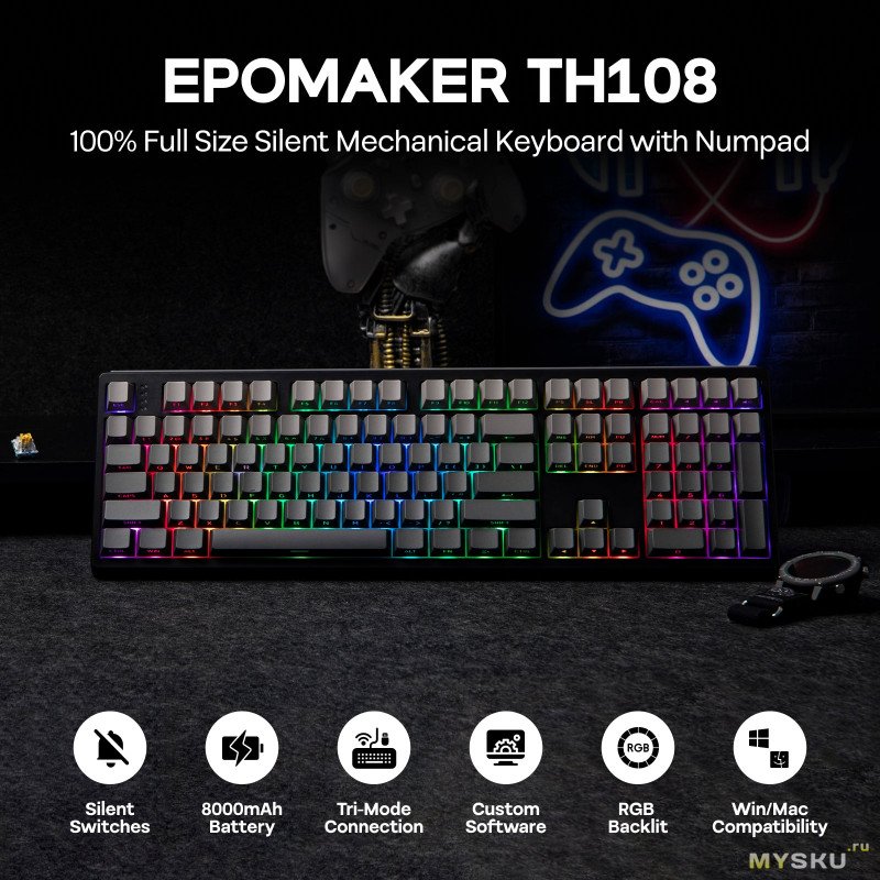 EPOMAKER TH108 Black вызвала у меня противоречивые чувства, цена явно задрана вверх, да тихо и с приятным звуком нажатия, равномерная подсветка, но «жидкий» пластик в корпусе. Маркировка sideprint ок, многие так делают, но паттерна сверху интересного не хватает, просто скучный серый цвет. Раскладка полноценная и оптимальный ход клавиш, но не хватает экрана и энкодера, как в версии TH108 Pro, тут громкость управляется просто кнопками. Геймерам, которым важны отзывчивость переключателей, низкая задержка и настраиваемая раскладка с подсветкой может и зайти. В плюсах еще универсальность подключения и емкий АКБ для длительной работы без частых подзарядок. Но как то хотелось бы чего то более технологичного и крепкого.Спасибо за внимание. Удачных покупок!