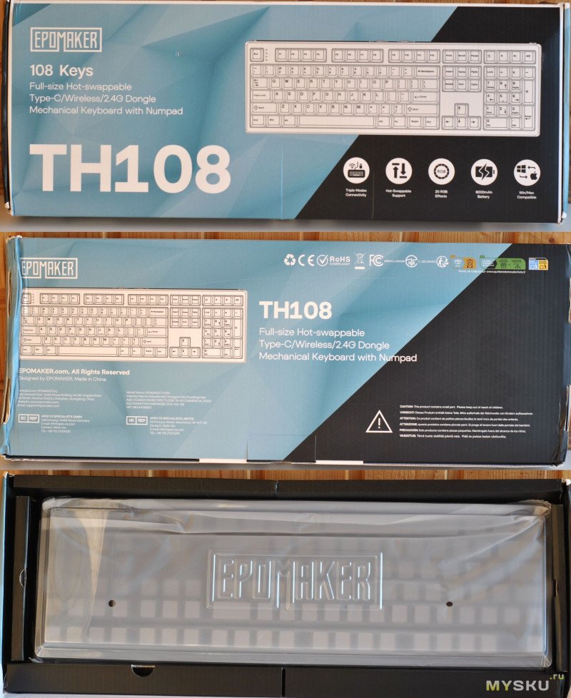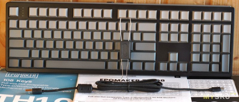 EPOMAKER TH108 Black вызвала у меня противоречивые чувства, цена явно задрана вверх, да тихо и с приятным звуком нажатия, равномерная подсветка, но «жидкий» пластик в корпусе. Маркировка sideprint ок, многие так делают, но паттерна сверху интересного не хватает, просто скучный серый цвет. Раскладка полноценная и оптимальный ход клавиш, но не хватает экрана и энкодера, как в версии TH108 Pro, тут громкость управляется просто кнопками. Геймерам, которым важны отзывчивость переключателей, низкая задержка и настраиваемая раскладка с подсветкой может и зайти. В плюсах еще универсальность подключения и емкий АКБ для длительной работы без частых подзарядок. Но как то хотелось бы чего то более технологичного и крепкого.
