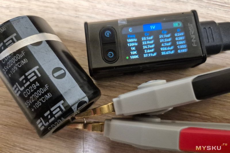 Можно посмотреть на зависимость емкости конденсатора 22000 мкФ от частоты и напряжения измерения.
