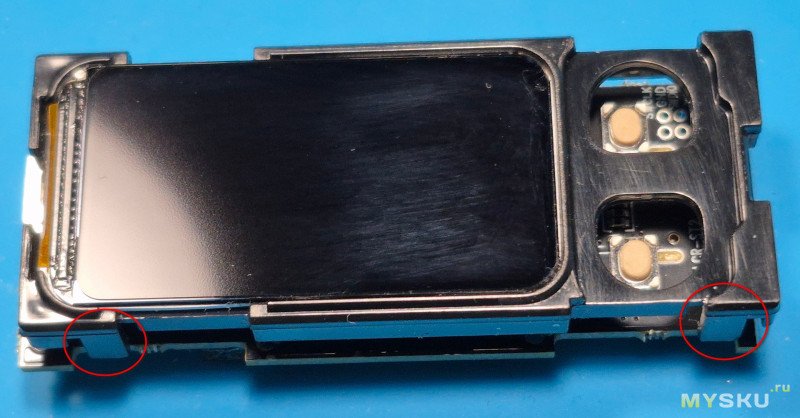 Далее чтобы снять плату нам надо отщелкнуть две защелки удерживающие модуль дисплея в корпусе