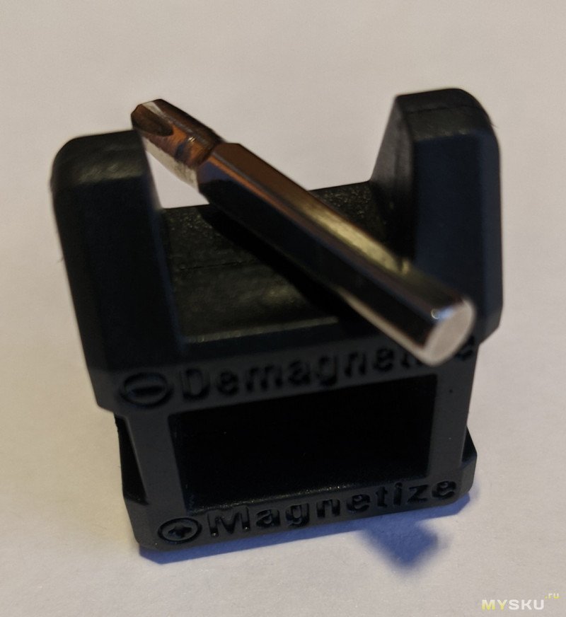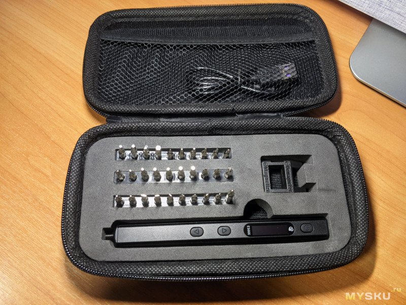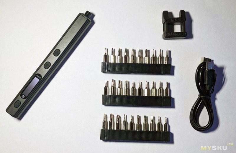 Помимо самой отвёртки, в комплекте был магнитайзер/демагнтитайзер (в целом прикольная штука, однако учитывая, что биты фиксируются в отвёртке в том числе и с помощью магнитов, размагничивание не всегда эффективное, а вот намагничивание работает очень хорошо), кабель зарядки USB-C и 3 набора по 10 бит в каждом (всего 30).