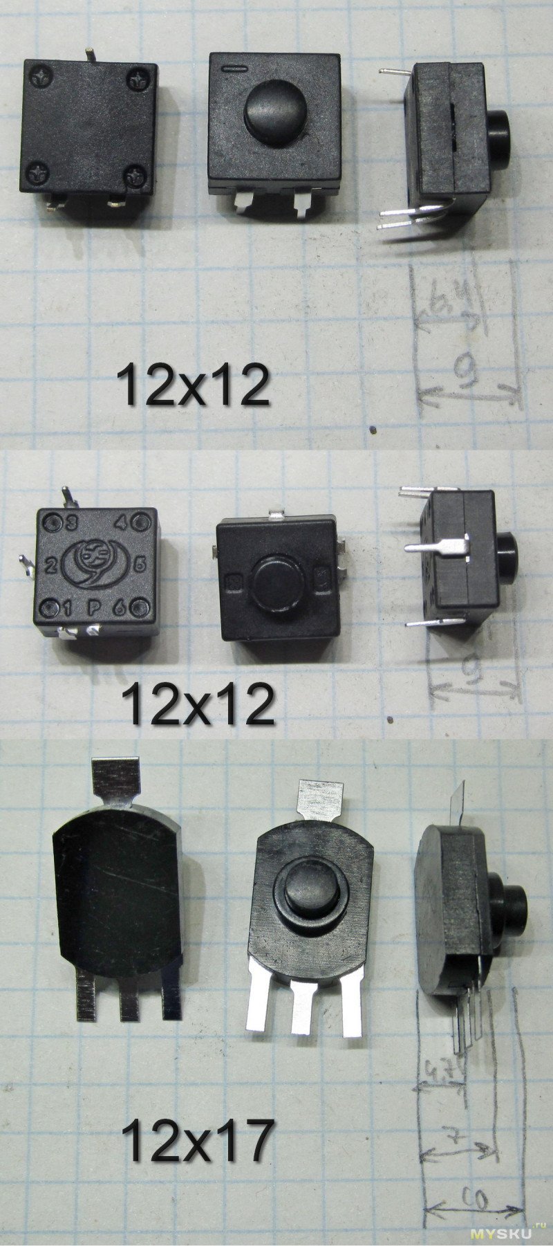 Как видим, потенциально переключатели 2 типа могут поддерживать до 6+выкл положений, но на практике даже 7-контактные я смог найти только на 3+выкл, но с попарным включением, и тут упоминается и прошлый вариант и вариант на 5 положений. Скорее всего есть и другие разновидности, желающие могут озадачиться поиском самостоятельно. Также существуют аналогичные переключатели в меньшем, 8*8мм корпусе, но существенно дороже с учетом доставки, и непонятно что там с внутренней схемой, так что покупать их ради интереса мне не сильно хочется — любопытство я уже удовлетворил обозреваемыми. Но например вот тут неплохой ассортимент, аж 10 разновидностей.