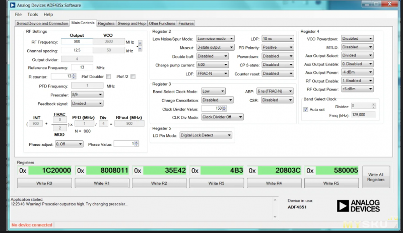 ADF4351, которая по сути является умным генератором частот. Она умеет создавать сигнал нужной частоты почти в любом месте диапазона от 35 МГц до 4,4 ГГц.