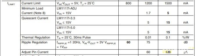 Есть минимальный ток нагрузки (но только для регулируемых версий — вот это я не понимаю почему), Quiescent Current — миллиамперы и Adjust Pin Current (это же земля или нет?) — микроамперы.