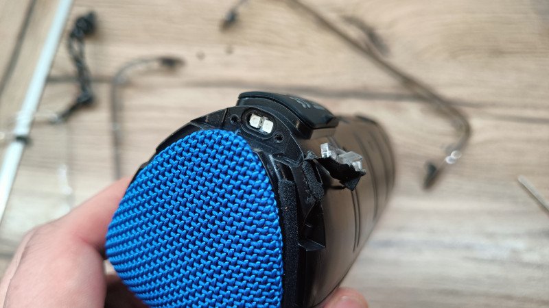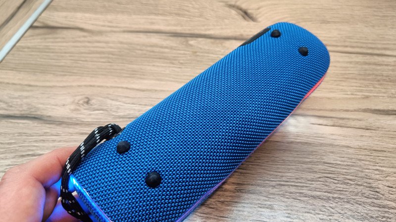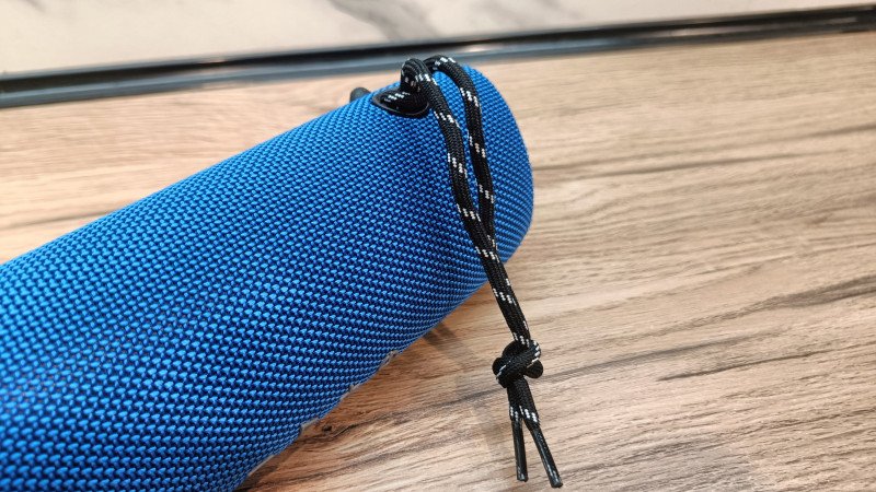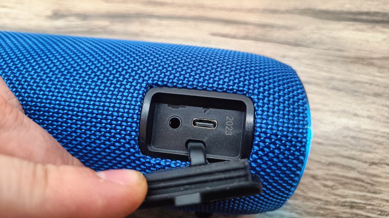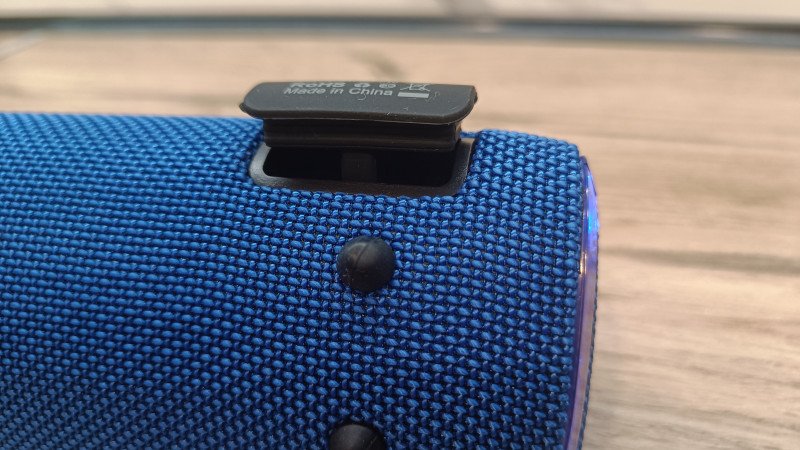 Кольцо для темляка размещается с тыльной стороны. Там же спрятаны порты для подключения: USB Type-C для зарядки и аудиовход mini-jack 3.5 мм. Оба гнезда защищены плотной резиновой крышкой, надежно закрывающей контакты от попадания влаги и грязи. Судя по заявлениям производителя, колонка может выдерживать кратковременные погружения в воду. Погружал в тазик с водой, звук глухой, но есть и колонка не выключается.