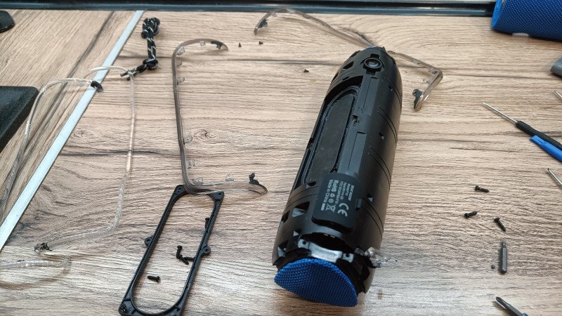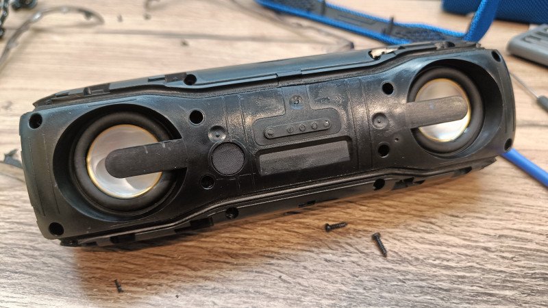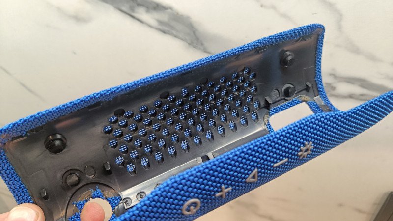 Чтобы добраться до внутренностей, придется вспотеть. Корпус очень плотно собран, множество защелок, саморезов и уплотнителей. Колонка в собранном виде имеет очень жесткий корпус. «Шкурка» снимается со скрипом, так как приходится отстегивать множество защелок.