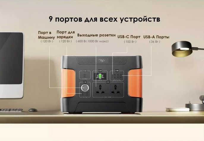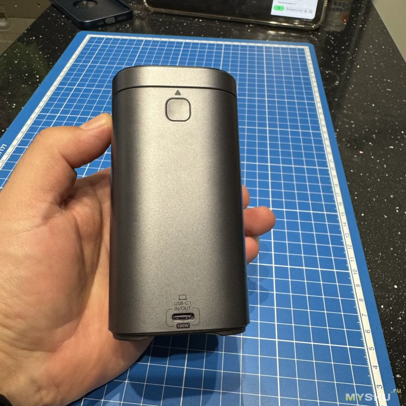 Итак, что мы тут видим? Довольно массивный и тяжёлый «кирпичик». На задней стенке которого расположена многофункциональная кнопка и основной порт USB C зарядки/разрядки, поддерживающий зарядку до 65W и разряд до 100W. Спереди ещё два порта USB C и USB A, с мощностью зарядки/разрядки 45W и 22.5W разрядки соответственно.