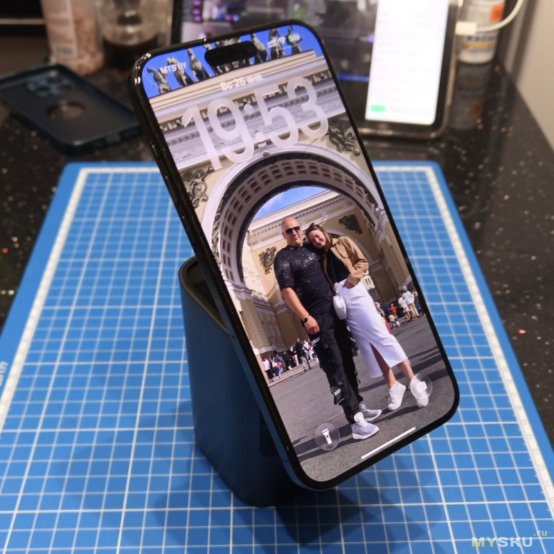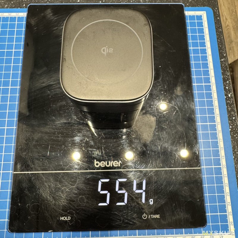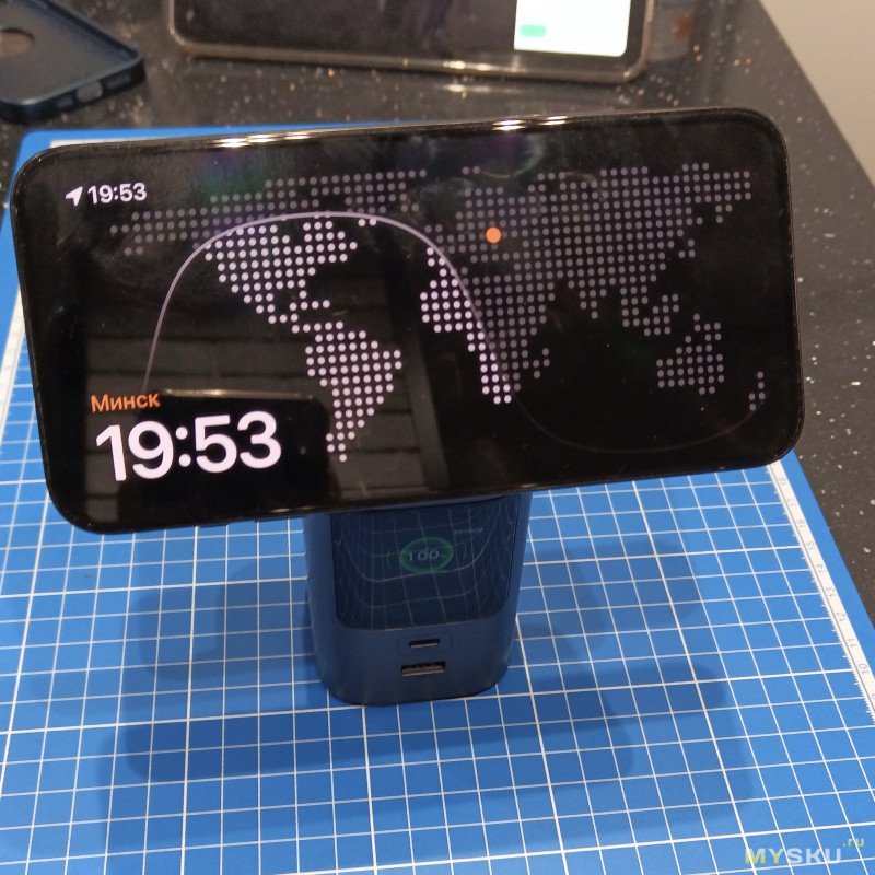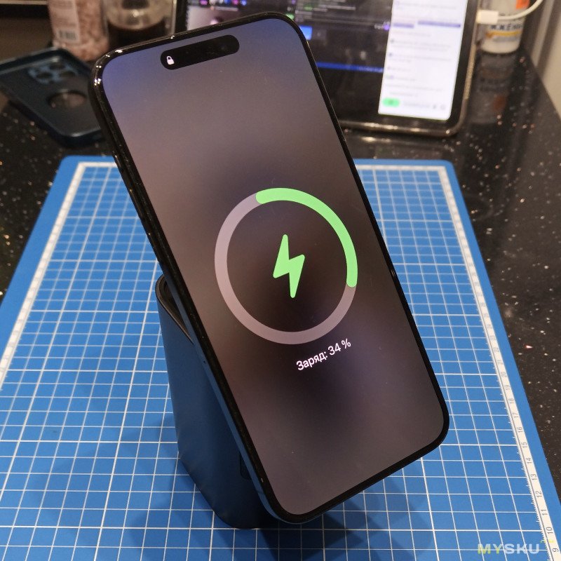 По беспроводной зарядке. Конечно же я ей пользовался и не раз. Заряжал в основном телефон и несколько раз друзьям часы и наушники. Никаких нареканий нет. Магнитит и держит хорошо, заряжает тоже неплохо. Не особо при этом греется. По эффективности — iPhone 15 Pro Max при зарядке с 5% до 100 оставляет в банке 62% энергии. А при зарядке по проводу 70%. Это если заряжать до 100. Если же использовать щадящий режим для аккумулятора и заряжать до 80%, то цифры соответственно будут другие, пропорционально зависящие от вышеуказанных.