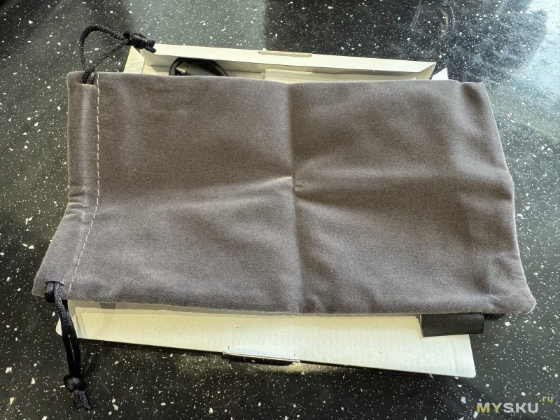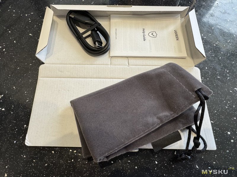 Комплектация, помимо большого количества бумажек на разных языках, включая русский, состоит из привычного югриновского кабеля 0.5 м и тканевого чехла