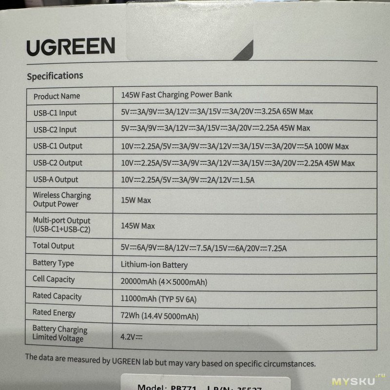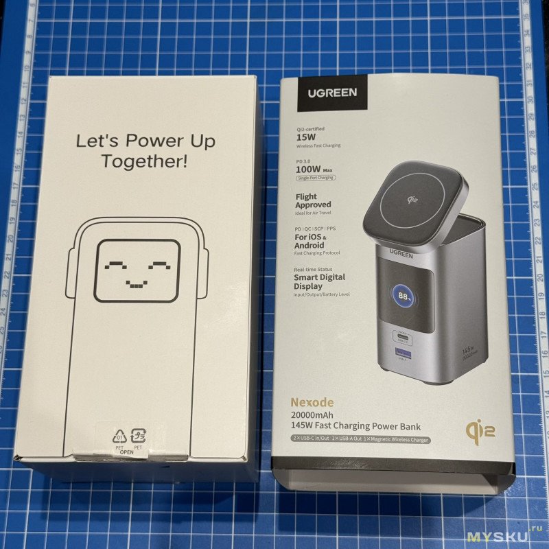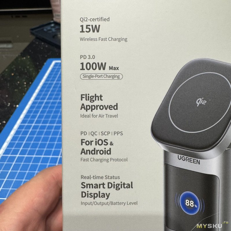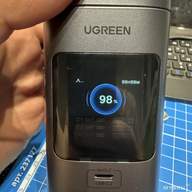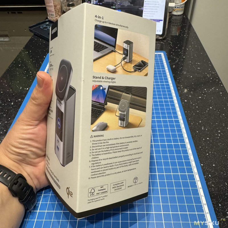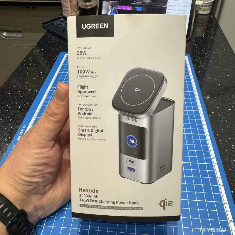 Мощный и довольно тяжёлый повербанк от Ugreen с быстрой зарядкой, суммарной мощностью всех портов до 145W, поддержкой Qi2 беспроводной зарядки, PD 3.0 и одновременной зарядкой до четырёх различных устройств. И информационным цветным TFT дисплеем.