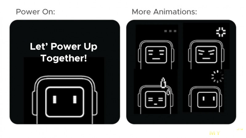 На дисплее так же отображаются анимированные смайлики, в зависимости от степени зарядки